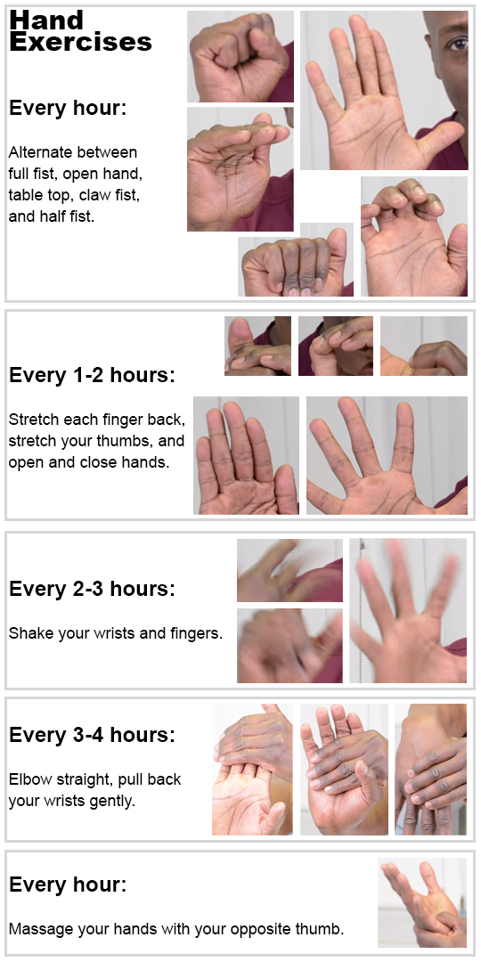 - Break the repetition. Take regular breaks from the computer to stretch your arms and hands (see image below).